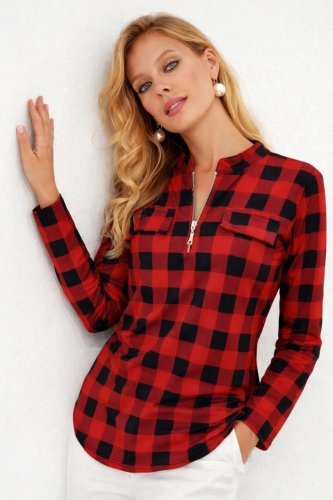• Kadın uzun kollu hakim yaka yakadan fermuarlı geometrik desenli süprem bluz