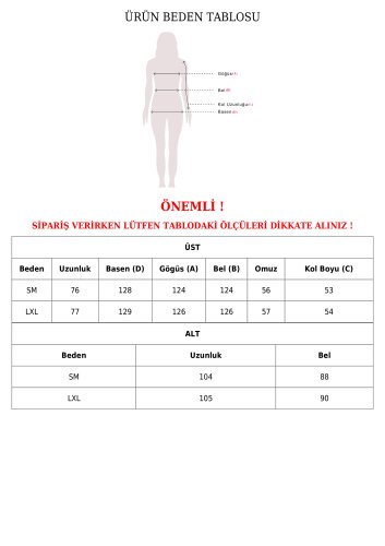 • Modelin Ölçüleri: Boy:165, Kilo:55, Göğüs:90, Bel:72, Kalça: 100