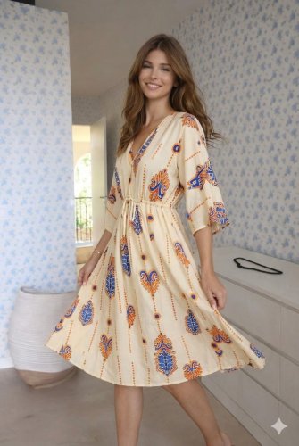 • Kadın v yaka beli bağçık detay etnik desen baskılı midi boy elbise